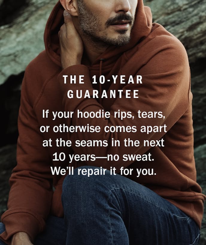 No matter what, if your sweatshirt rips or tears at any point in the next ten years, we will repair it free of charge. Your favorite, go-to layer should remain your favorite for as long as possible. That is the type of vow we make with these 10-year hoodies.